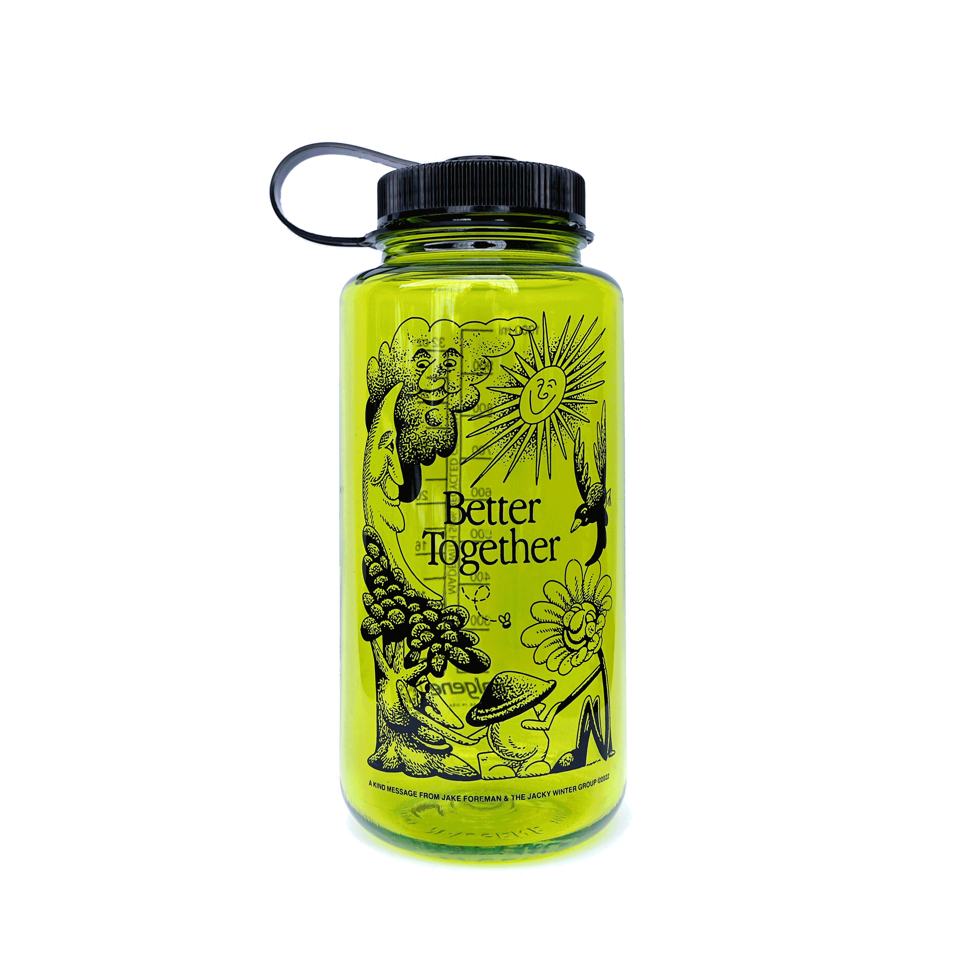 Classic 32 oz Nalgene wide mouth water bottle made from material derived from 50% waste plastic (using ISCC certified mass balance)BPA/BPS Free, Dishwasher Safe, Fits Filtration Devices, Fits Ice Cubes, Leak-Proof Guarantee - Continuous, straight shouldered semi-buttress threads (ooh) keep the bottle sealed tight.Artwork by Fuchsia MacAree, Jake Foreman, and Rebecca ter Borg,