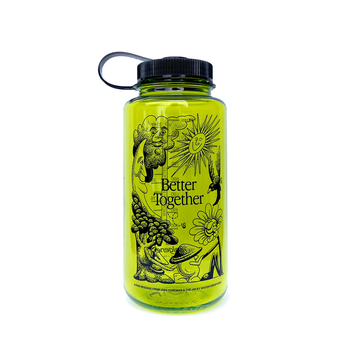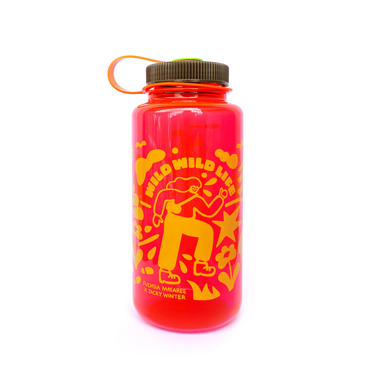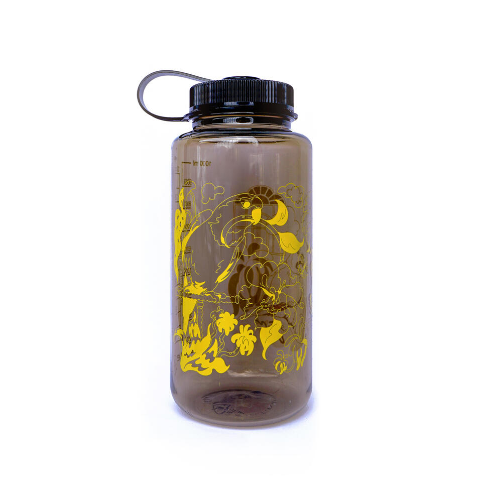 Classic 32 oz Nalgene wide mouth water bottle made from material derived from 50% waste plastic (using ISCC certified mass balance)BPA/BPS Free, Dishwasher Safe, Fits Filtration Devices, Fits Ice Cubes, Leak-Proof Guarantee - Continuous, straight shouldered semi-buttress threads (ooh) keep the bottle sealed tight.Artwork by Fuchsia MacAree, Jake Foreman, and Rebecca ter Borg,